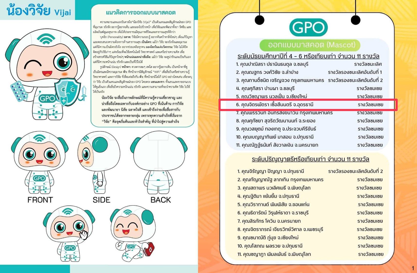วิทยาลัยเทคโนโลยีอีสานเหนือ ขอแสดงความยินดี กับนักศึกษา นางสาวจิตรพัตรา เชื้อสีนนตรีระดับ ปวส.1/19 สาขาเทคโนโลยีธุรกิจดิจิทัล ที่ คว้ารางวัล ชมเชยจากการประกวดออกแบบมาสคอต (Mascot)ในโครงการ GPO Creative Contest 2025 จัดโดย องค์การเภสัชกรรม