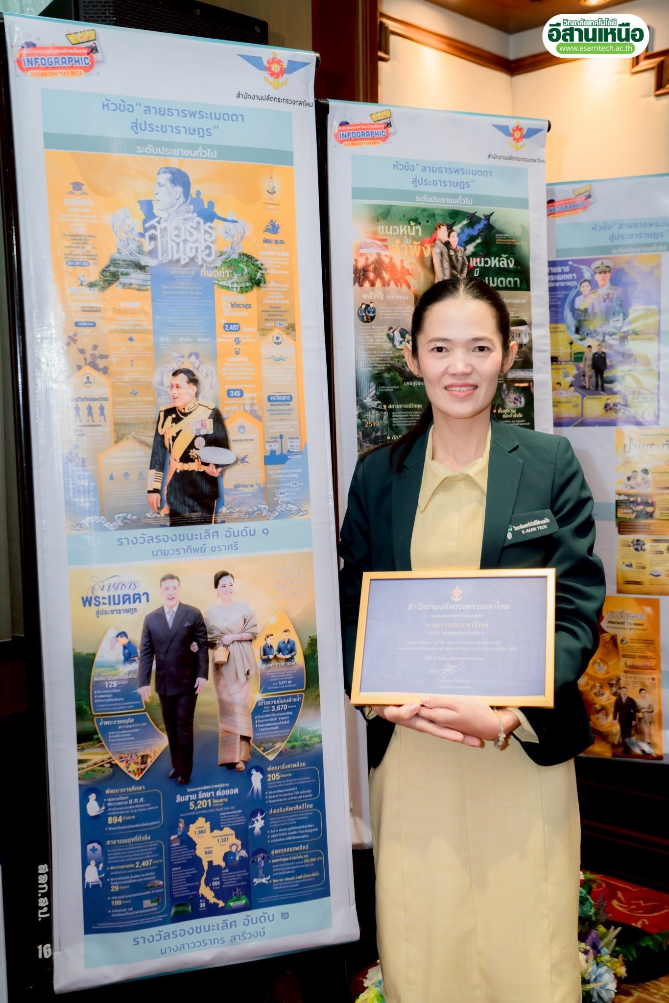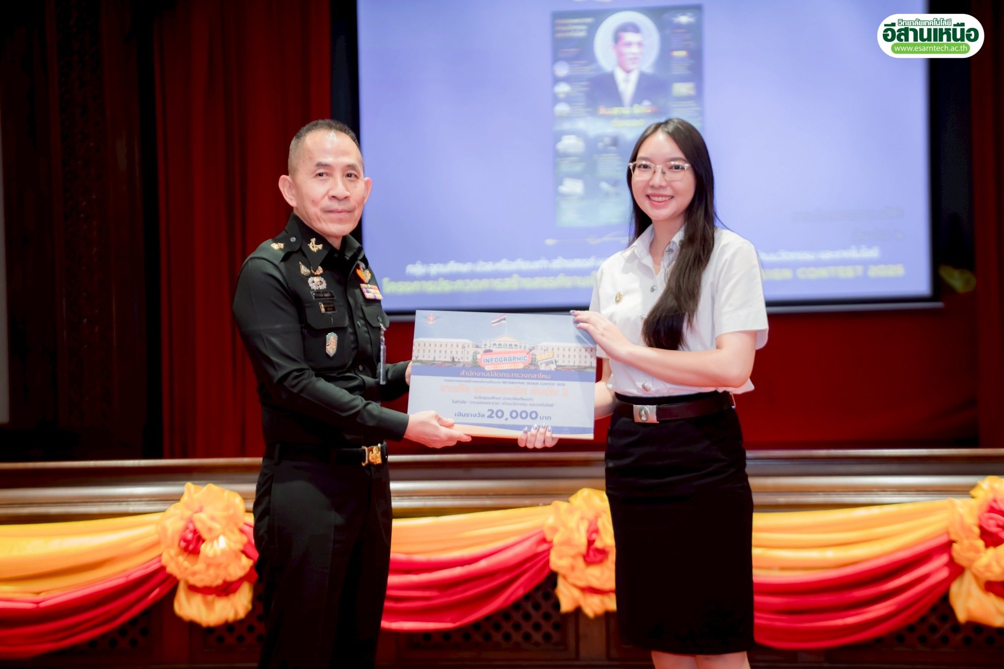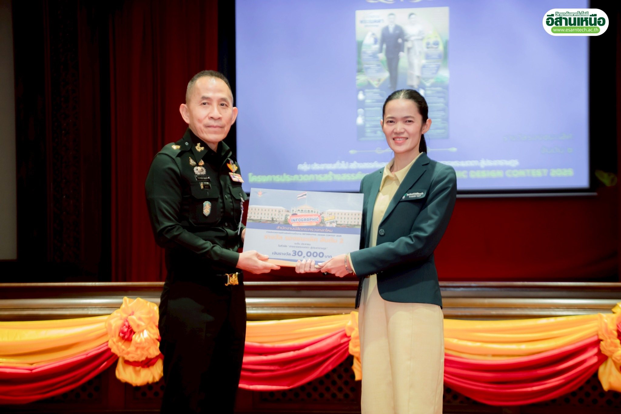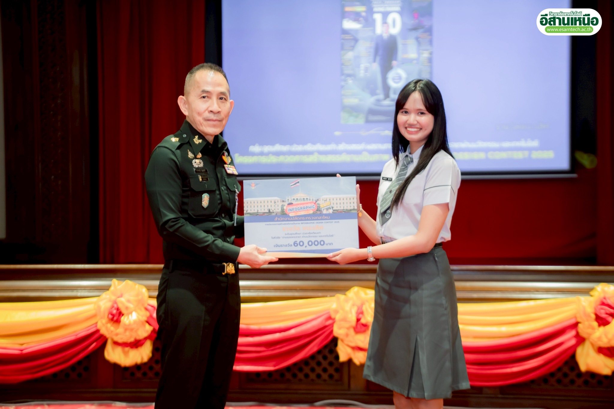 18/9/2568วันพุธที่ 17 กันยายน 2568 เวลา 10.30 น. สำนักงานเลขานุการสำนักงานปลัดกระทรวงกลาโหม จัดพิธีมอบรางวัล “การประกวดการสร้างสรรค์งานเป็นภาพ Infographic Design” ประจำปี 2568 ภายใต้หัวข้อ “การเทิดทูน การปกป้อง สถาบันพระมหากษัตริย์” โดยมี พลเอก ธราพงษ์ มะละคำ รองปลัดกระทรวงกลาโหม เป็นประธานในพิธีมอบรางวัล ณ ห้องสุรศักดิ์มนตรี ศาลาว่าการกลาโหม กรุงเทพมหานคร ผู้สร้างเกียรติประวัติให้ “อีสานเหนือ”- รางวัลชนะเลิศ ระดับประเทศ ระดับ อุดมศึกษา ปวส. หรือเทียบเท่า - นางสาวมาศประภา สุทธิภักดี (ปวส.2/16 สาขาเทคโนโลยีธุรกิจดิจิทัล) หัวข้อ: “ตามรอยพระราชา ผ่านนวัตกรรมและเทคโนโลยี” -รางวัลรองชนะเลิศ อันดับ 2 -อาจารย์วราภร สารีวงษ์- หัวข้อ: “สายธารพระเมตตา สู่ประชาราษฎร” -รางวัลรองชนะเลิศ อันดับ 2 (ศิษย์เก่า) -นางสาวธัญลักษณ์ ภัยระงับ-หัวข้อ: “ตามรอยพระราชา ผ่านนวัตกรรมและเทคโนโลยี” ความสำเร็จครั้งนี้ ไม่เพียงแค่เป็นเกียรติยศของผู้ได้รับรางวัล แต่ยังเป็น “ชัยชนะของวิทยาลัยเทคโนโลยีอีสานเหนือ” ที่สามารถก้าวขึ้นสู่เวทีระดับประเทศในนามของ สถาบันอาชีวศึกษาในภาคอีสานเหนือ