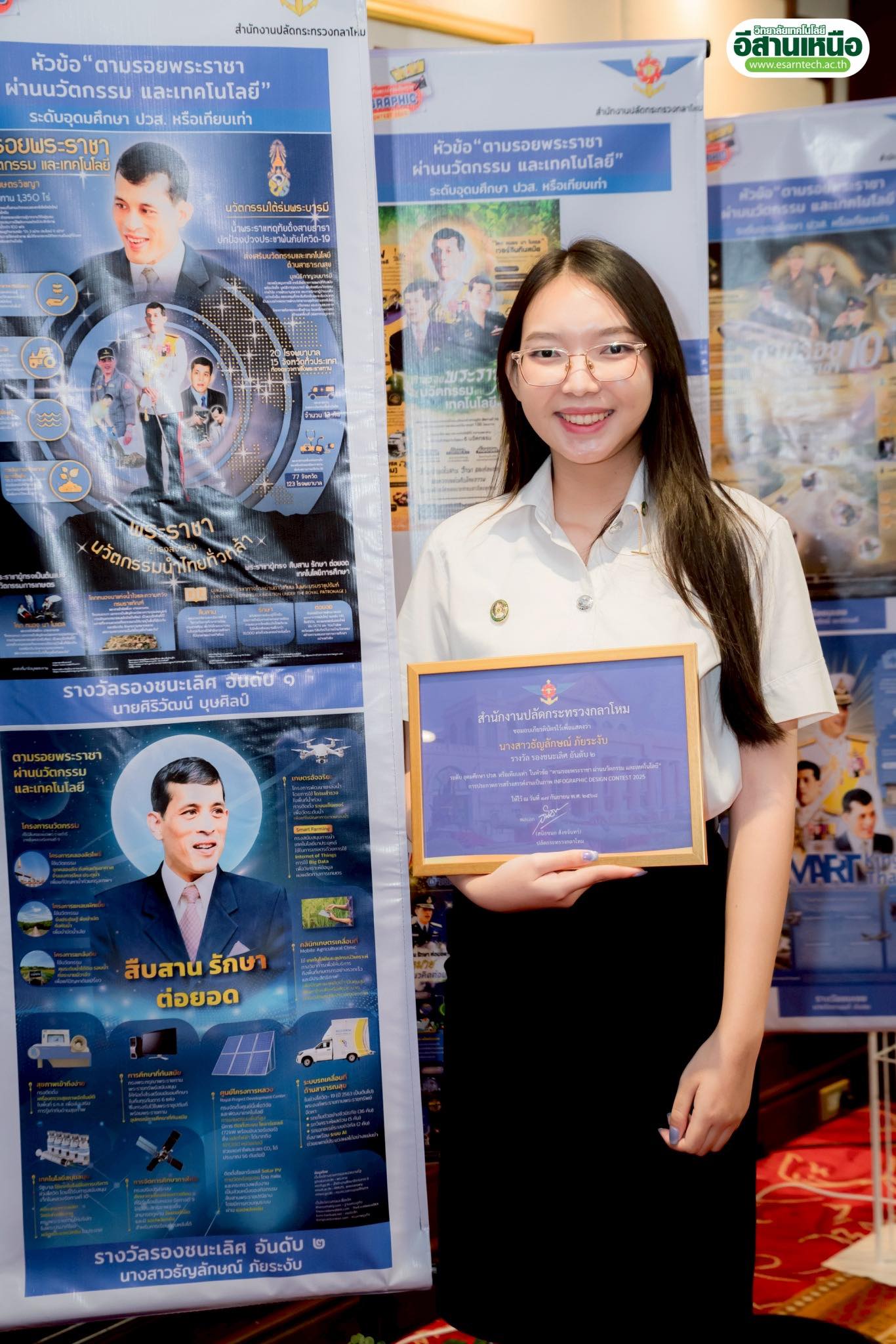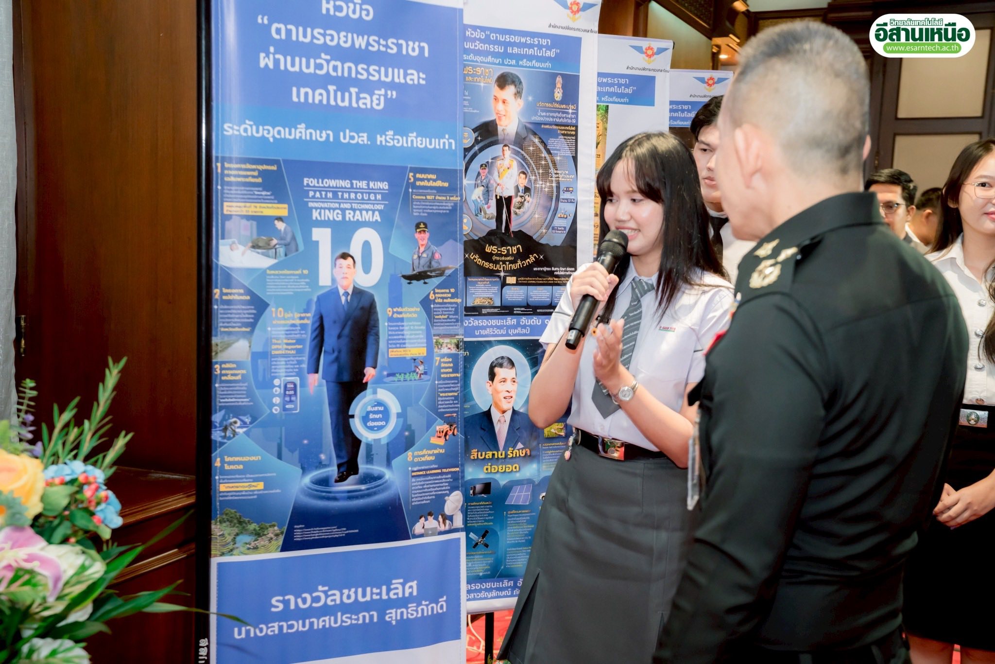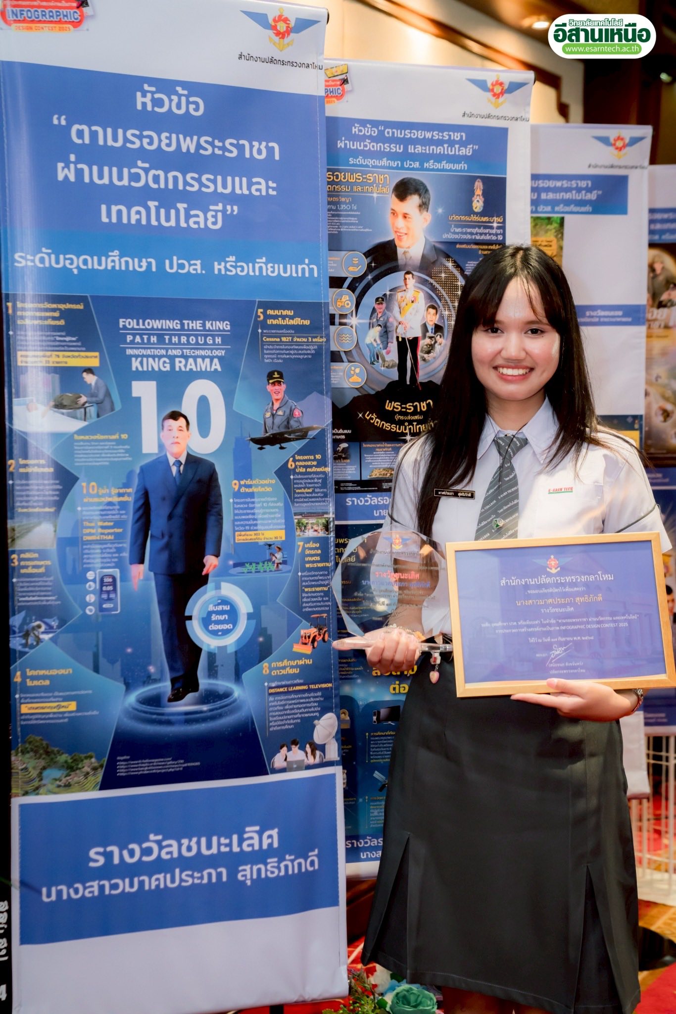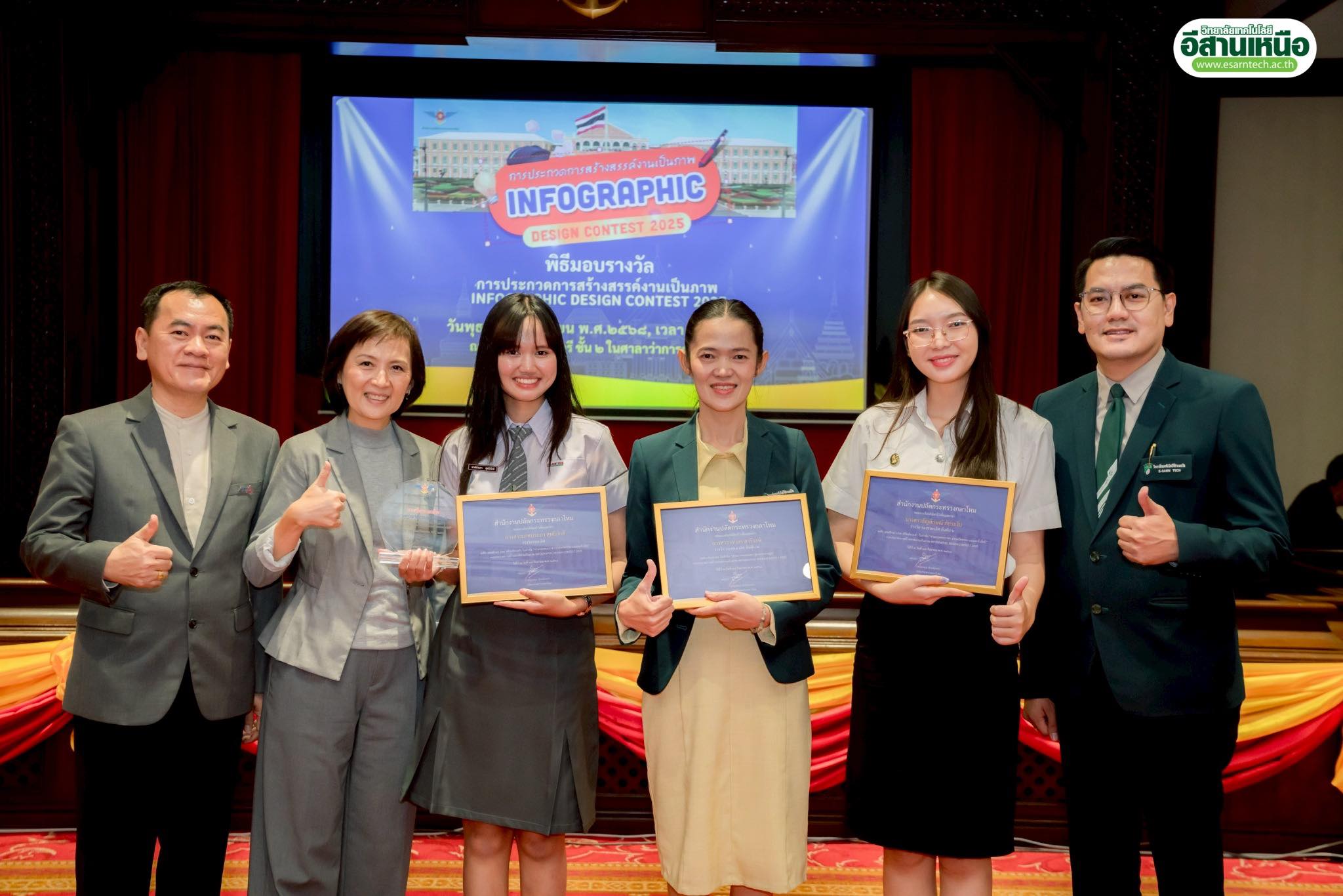 18/9/2568วันพุธที่ 17 กันยายน 2568 เวลา 10.30 น. สำนักงานเลขานุการสำนักงานปลัดกระทรวงกลาโหม จัดพิธีมอบรางวัล “การประกวดการสร้างสรรค์งานเป็นภาพ Infographic Design” ประจำปี 2568 ภายใต้หัวข้อ “การเทิดทูน การปกป้อง สถาบันพระมหากษัตริย์” โดยมี พลเอก ธราพงษ์ มะละคำ รองปลัดกระทรวงกลาโหม เป็นประธานในพิธีมอบรางวัล ณ ห้องสุรศักดิ์มนตรี ศาลาว่าการกลาโหม กรุงเทพมหานคร ผู้สร้างเกียรติประวัติให้ “อีสานเหนือ”- รางวัลชนะเลิศ ระดับประเทศ ระดับ อุดมศึกษา ปวส. หรือเทียบเท่า - นางสาวมาศประภา สุทธิภักดี (ปวส.2/16 สาขาเทคโนโลยีธุรกิจดิจิทัล) หัวข้อ: “ตามรอยพระราชา ผ่านนวัตกรรมและเทคโนโลยี” -รางวัลรองชนะเลิศ อันดับ 2 -อาจารย์วราภร สารีวงษ์- หัวข้อ: “สายธารพระเมตตา สู่ประชาราษฎร” -รางวัลรองชนะเลิศ อันดับ 2 (ศิษย์เก่า) -นางสาวธัญลักษณ์ ภัยระงับ-หัวข้อ: “ตามรอยพระราชา ผ่านนวัตกรรมและเทคโนโลยี” ความสำเร็จครั้งนี้ ไม่เพียงแค่เป็นเกียรติยศของผู้ได้รับรางวัล แต่ยังเป็น “ชัยชนะของวิทยาลัยเทคโนโลยีอีสานเหนือ” ที่สามารถก้าวขึ้นสู่เวทีระดับประเทศในนามของ สถาบันอาชีวศึกษาในภาคอีสานเหนือ